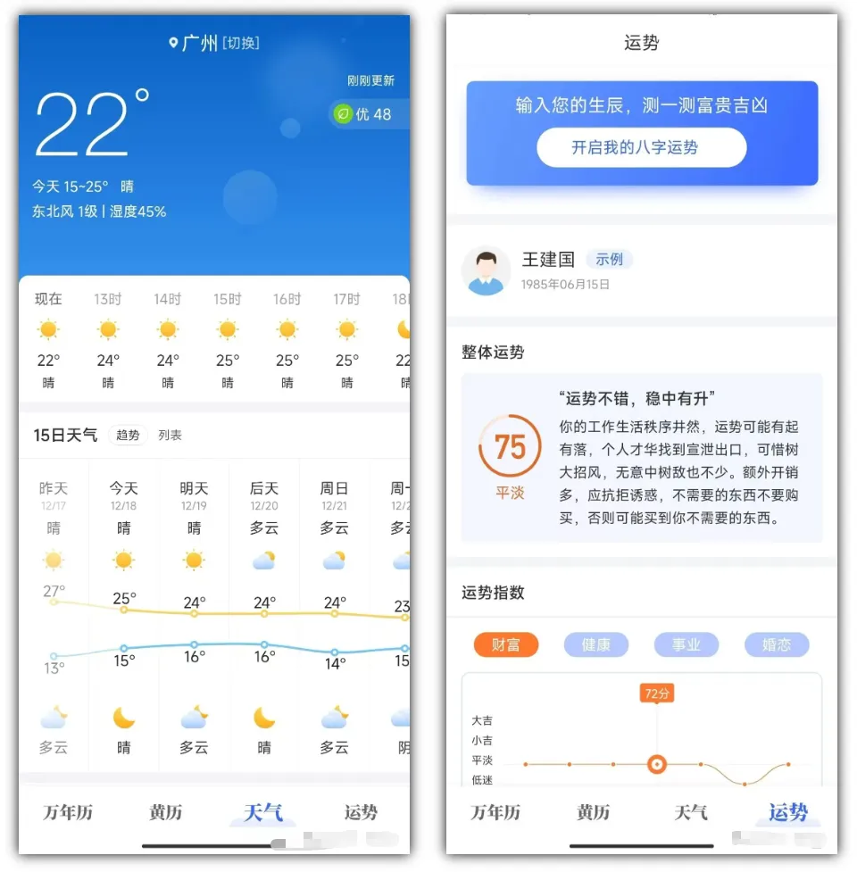 除此之外,软件还整合了天气、每日运势查询功能,一个工具满足查日期、看黄历、知天气的多重需求,国风设计 + 实用功能,安卓用户建议收藏!