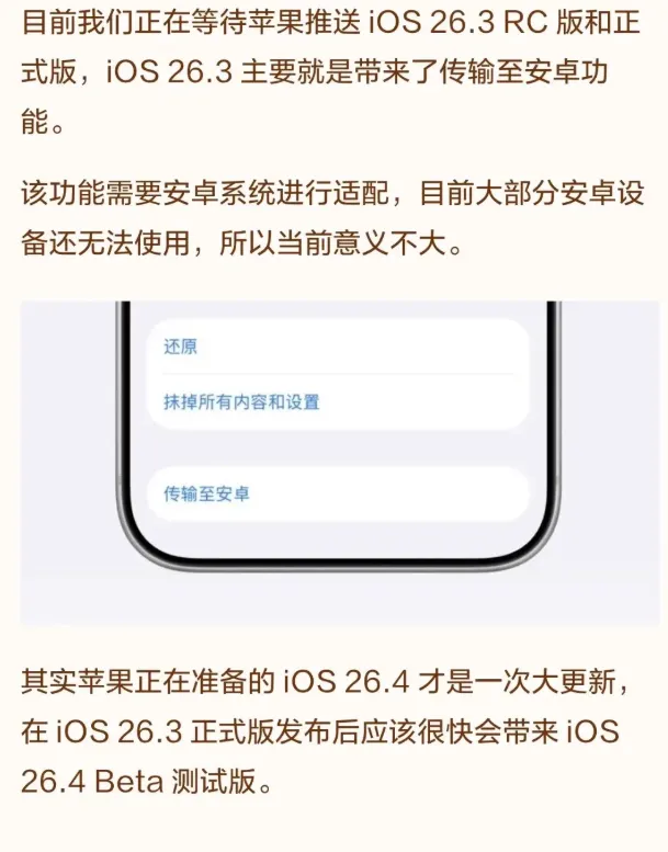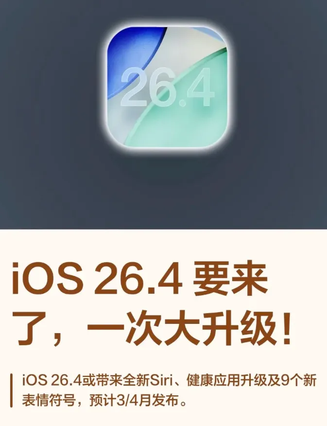 照往年的发布节奏看,iOS 26.4 的正式版大概在接下来两三周和其他系统一起推送,更像一个以稳定和安全修补为主的巩固包,后面要是有 26.5 或者下半年的 iOS 27,也算铺好地基.