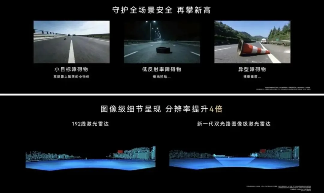 本次发布的激光雷达为当前全球量产最高线束规格,达到896线,采用业界首创双光路架构,集成广角与长焦双焦段接收单元,实现一体成像与“画中画”级细节呈现。相比前代192线产品,成像分辨率提升4倍,最远有效识别距离提升至162米,可在120米外识别高度仅14厘米的低矮障碍物,对低反射率目标的识别距离提升约190%,异型障碍物感知距离提升77%。硬件层面采用钢化膜玻璃视窗,硬度提升25%,耐久性能提升2倍,适应更复杂用车环境。