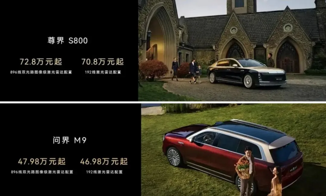 发布会同步公布,搭载新一代896线激光雷达的车型版本正式开启预订,尊界S800预售价格72.8万元起,问界M9预售价格47.98万元起,用户可选择新一代雷达版本或前代192线版本。