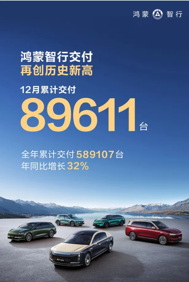 - • 全年数据:累计交付589,107台,同比增长32%;12月单月交付89,611台,创历史新高