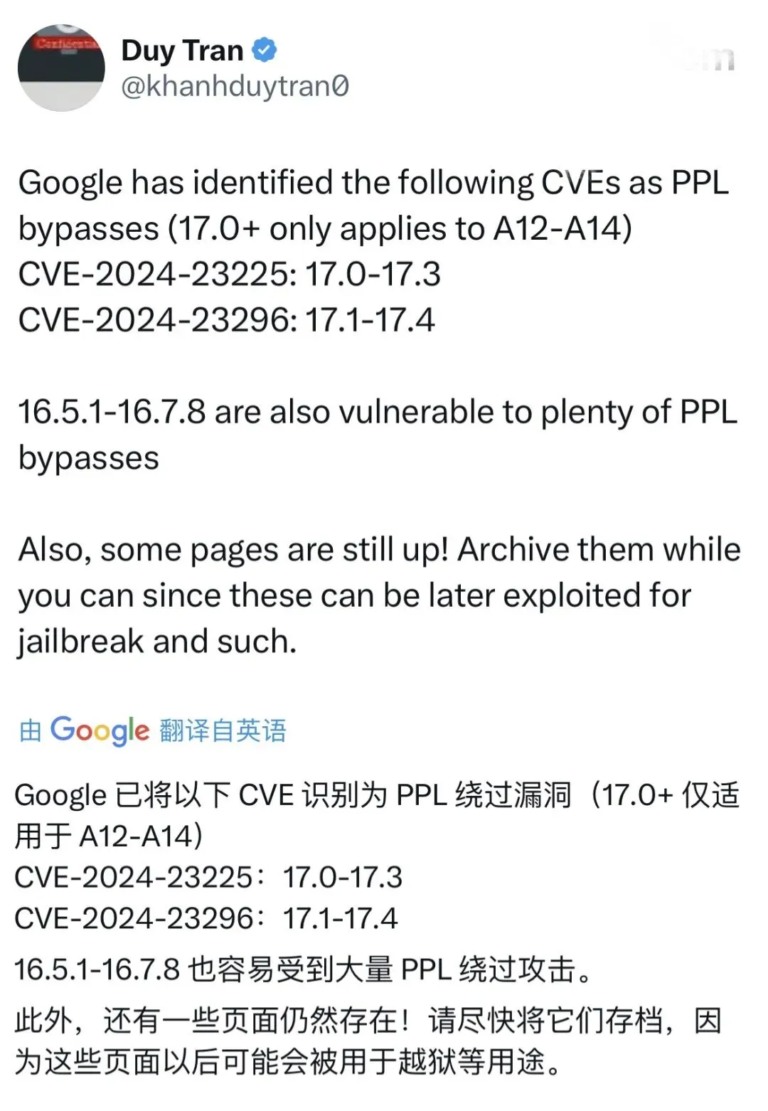Google 已将以下 CVE 识别为 PPL 绕过漏洞(iOS 17.0+ 仅适用于 A12-A14)