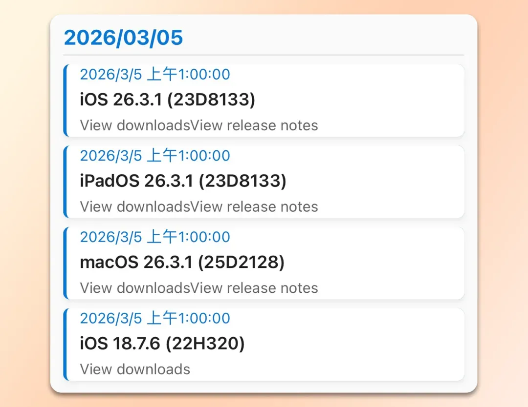 今天凌晨,苹果向用户推送了iOS 26.3.1和 iPadOS 26.3.1正式版系统,版本号为:23D8133,距离上一个正式版仅三周时间。