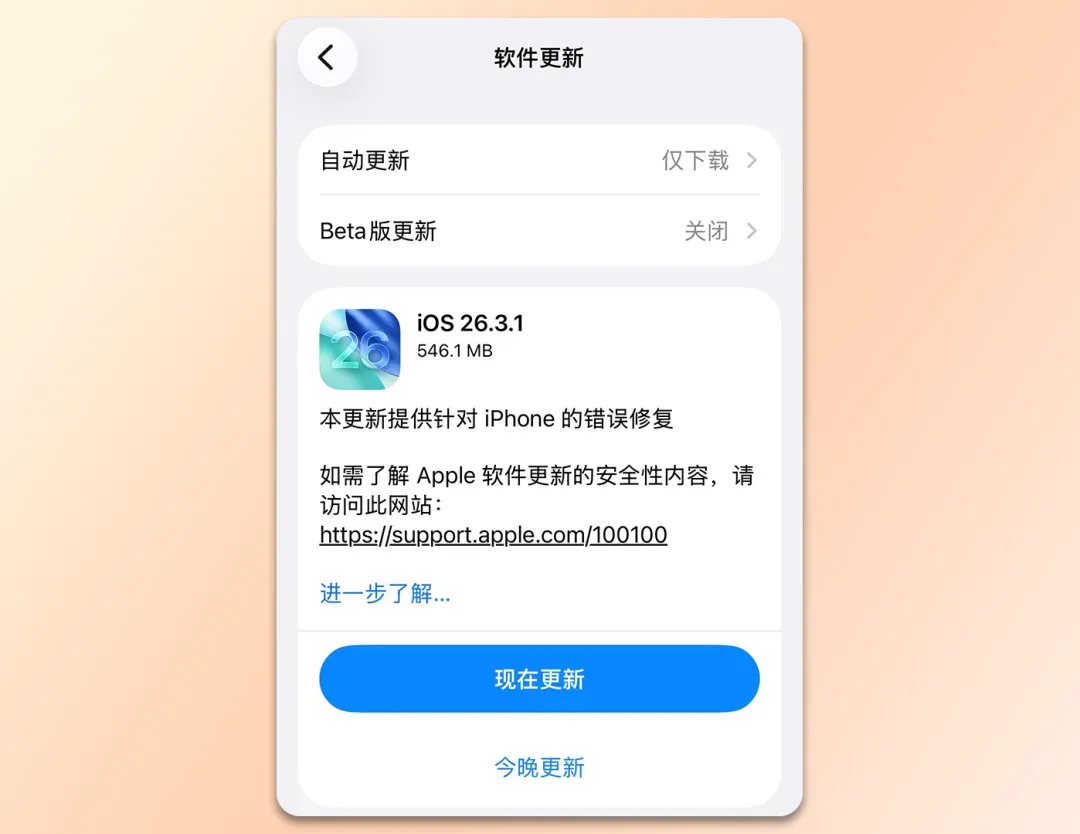 苹果的小版本更新,通常不会带来什么显著的新功能,主要是优化系统提升稳定性,感兴趣的小伙伴可以在设置-通用-软件更新进行升级。