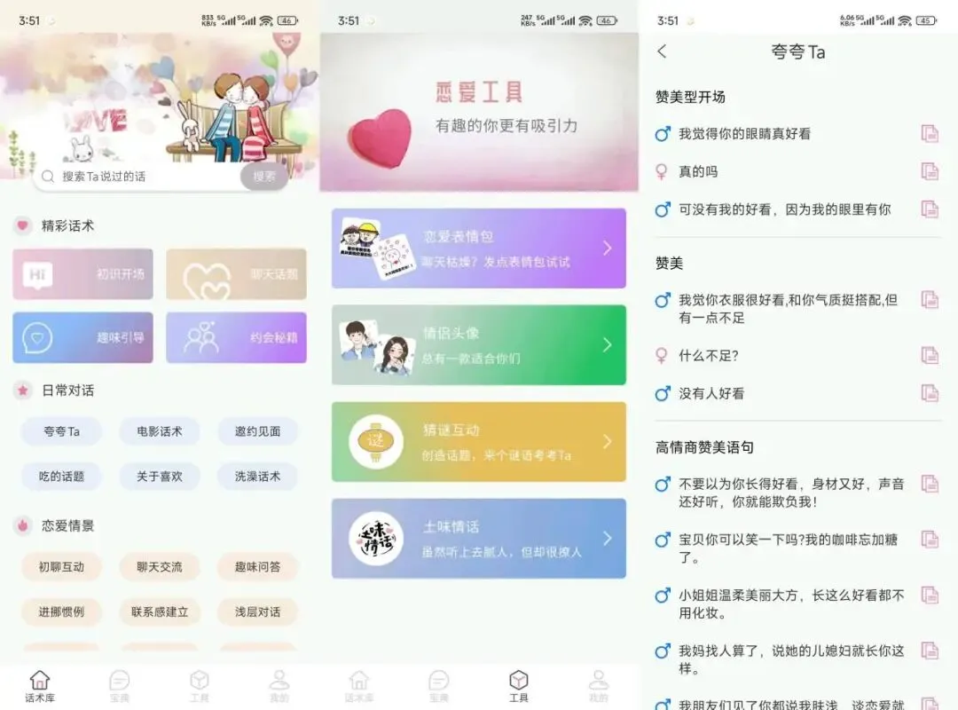 是一款实用高情商聊天话术APP,内置海量精选话术,覆盖搭讪开场、暧昧升温、约会邀约、哄人道歉、日常互动等全场景,支持关键词一键搜索,复制即用,轻松告别尬聊。界面简洁清爽,分类清晰,话术真诚不油腻,适合恋爱、社交、日常沟通使用,帮你快速提升表达力,让聊天更自然、更讨喜,社交效率翻倍。解锁会员功能