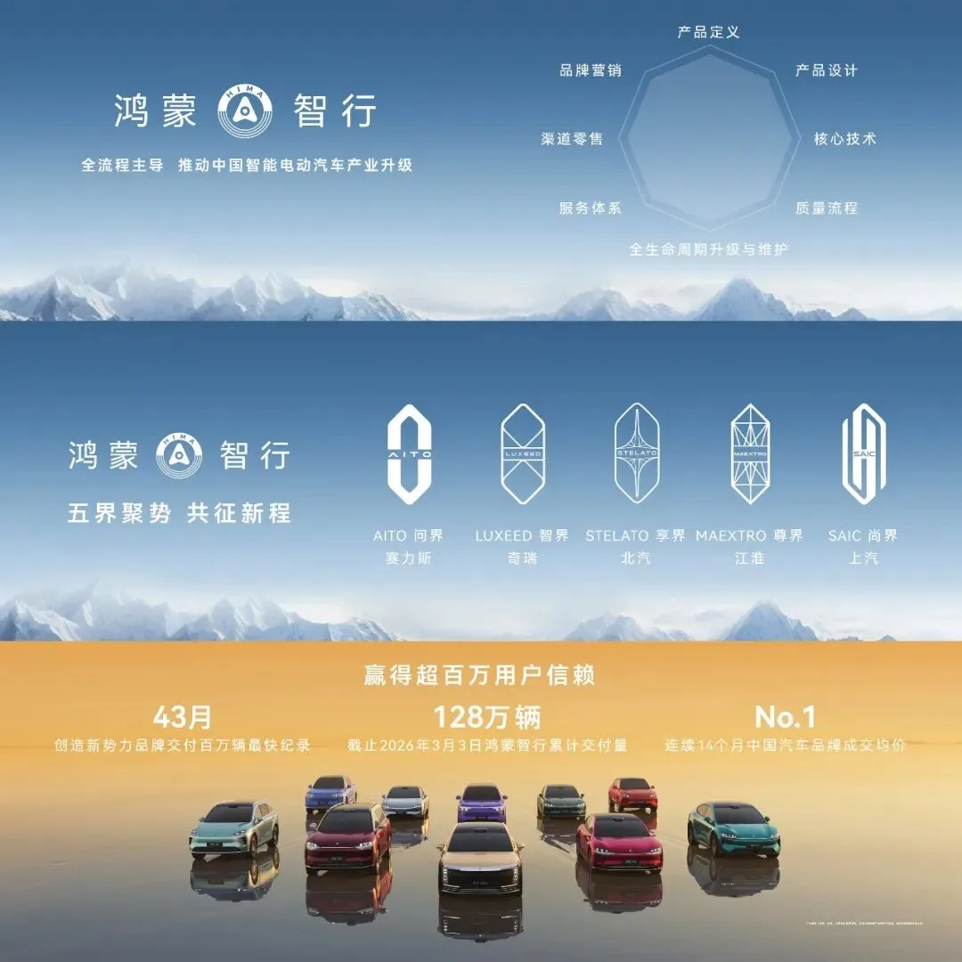 当传统豪华品牌还在为销量下滑焦虑时,鸿蒙智行用一组硬核数据刷新了中国高端智能汽车的天花板。2026年3月4日鸿蒙智行发布会上,累计交付128万辆、43个月破百万刷新新势力纪录、连续14个月中国汽车品牌成交均价第一、平均成交价39万元,一连串数字不仅印证了其市场认可度,更宣告中国品牌在高端汽车市场,正式实现从跟跑到领跑的历史性跨越。