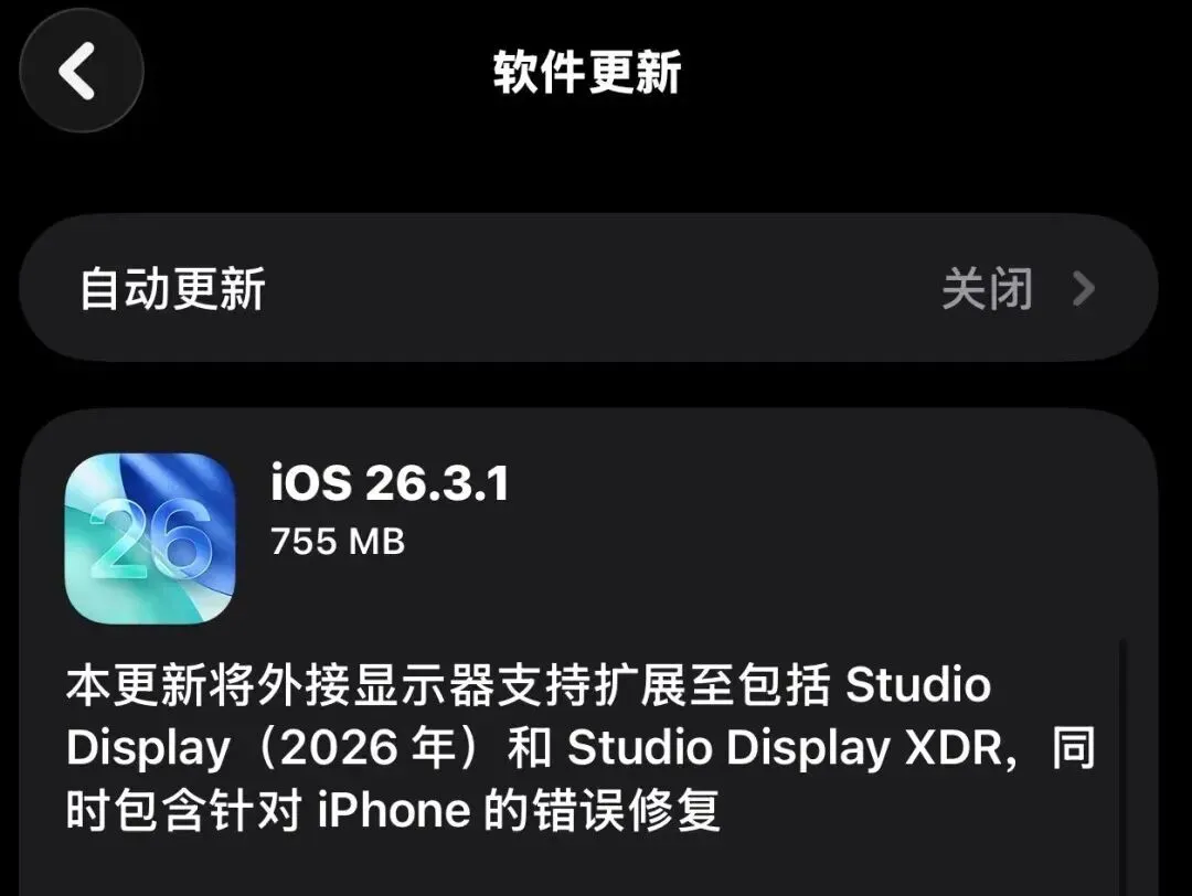 iOS 26.3.1 正式版已于近期面向全球用户推送,内部版本号 23D8133。与以往大版本更新不同,本次升级不包含任何新功能、新界面、新交互,是一次典型的稳定性修复+安全加固+体验优化型系统补丁。对于日常高频使用 iPhone、依赖车载 CarPlay、注重续航与流畅度的用户而言,这是一次非常值得升级的小版本更新。