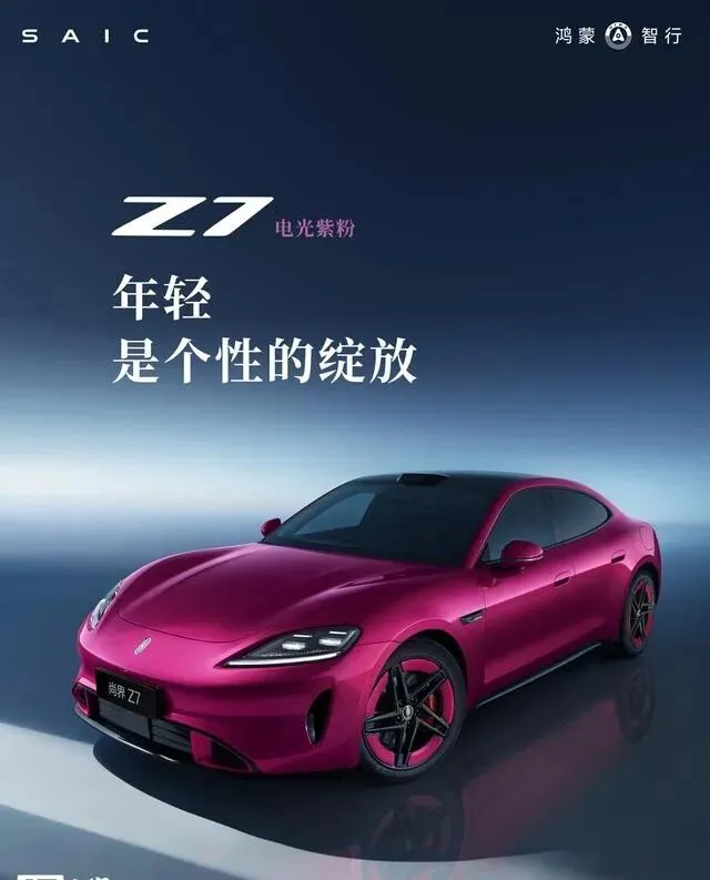 以前一说鸿蒙智行的车,大家第一反应是稳重、商务、家庭向,反正跟“躁”没什么关系。但这次尚界 Z7 从外观开始就换了路数。官方用了“高级型面”和“都市流光”这类词来描述设计语言,我理解下来,就是线条更利落、灯光更有识别度,少了一点圆润,多了一点攻击性。真正让现场骚动起来的,是那个叫“电光紫粉”的新颜色。严格说它介于紫和粉之间,灯光下偏紫,日光下又透出一点粉调,属于那种开出去不怕撞衫的选项。官方没说还有哪些颜色,但话里话外的意思是:配色会不少,年轻人想要个性化表达,这次给足了空间。中控屏会转,这思路有点意思