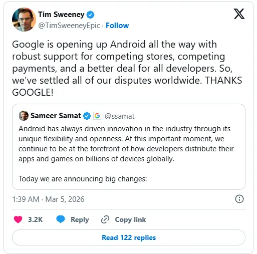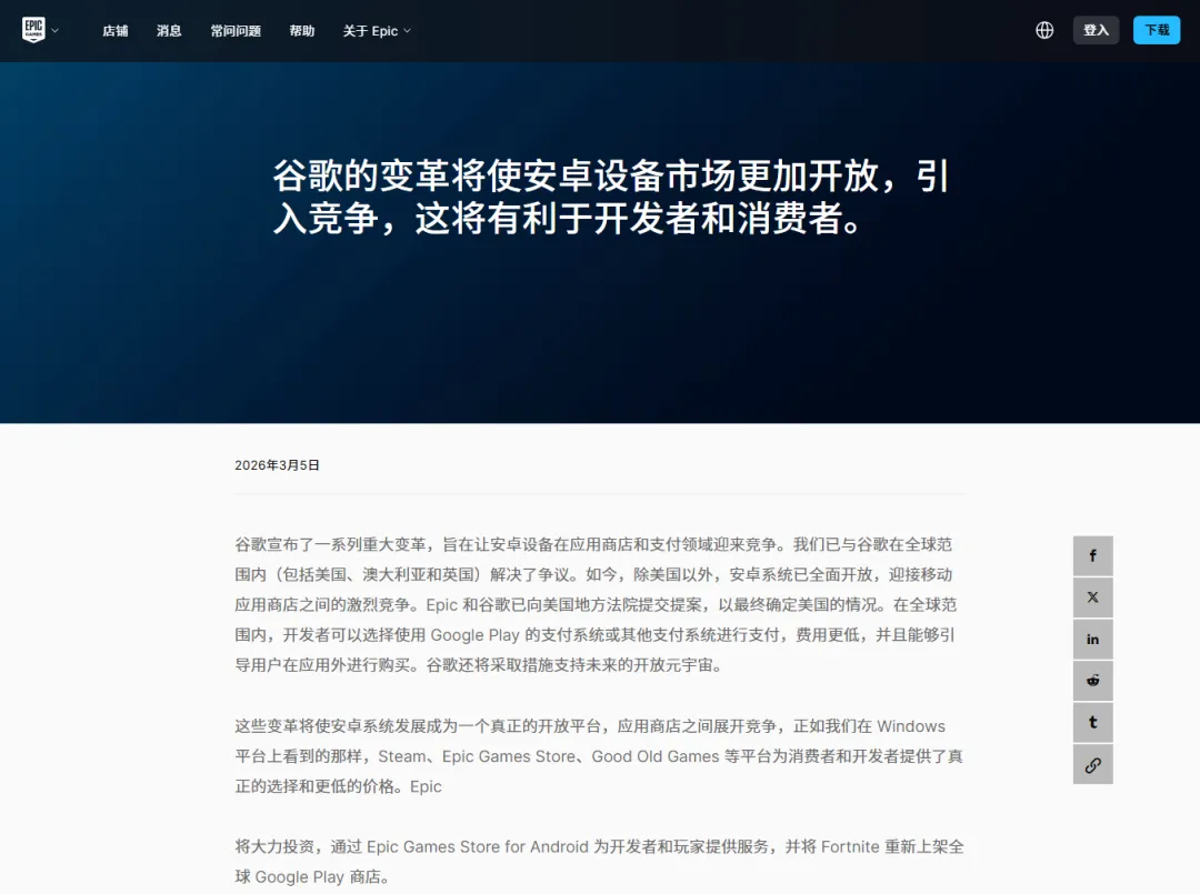 2026年3月4日,科技圈迎来重磅消息:谷歌正式与Epic Games达成全球和解,并宣布将对Android系统及Google Play进行一系列历史性改革。根据协议,Google Play佣金将大幅下调至20%,并允许开发者使用第三方支付系统。这场持续数年的法律战终于尘埃落定,标志着移动应用生态将迎来真正的开放时代。对全球开发者而言,这不仅意味着更低的运营成本,更预示着支付环节将打破垄断,迎来前所未有的选择自由。