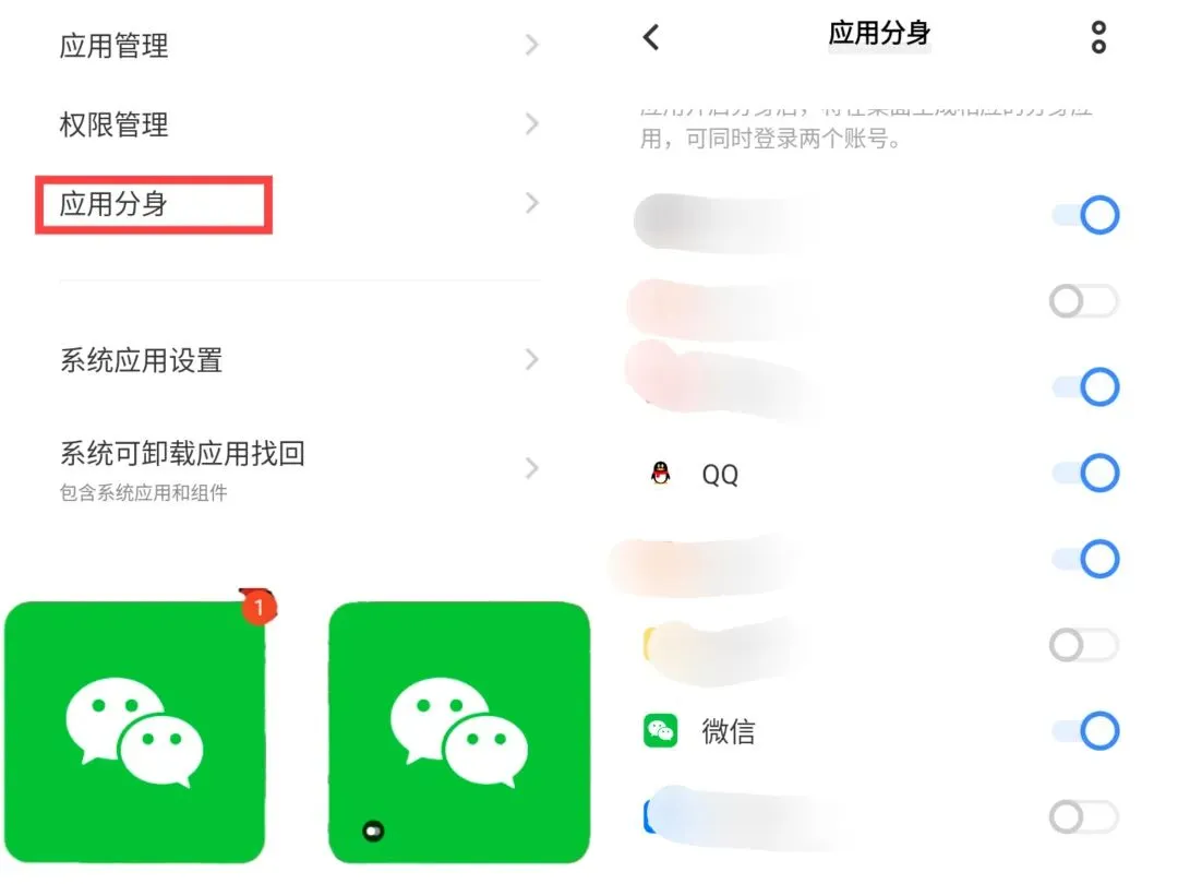 * 一键开启: 在列表里找到“微信”,点一下开关,桌面上就会多出一个带角标的微信。