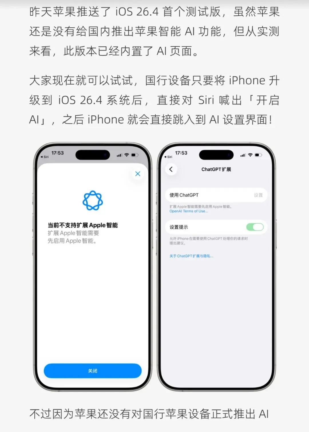 不过好消息是,本次更新悄悄预埋了AI底层接口,硬件与模型都在适配中。结合近期苹果加速本土化推进,业内预测国行AI大概率在iOS 27大版本落地。