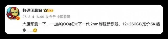 站哥一句“一加/iQOO/红米下一代2nm子系旗舰12+256GB 5K起步”,直接让网友炸开了锅。要知道红米K90 Pro Max3999元的起步价已让不少人不满,如今红米K100 Pro Max网传将站上4999元关口,这个价格让不少消费者直呼:不如冲主系旗舰,甚至直接选iPhone 18系列。