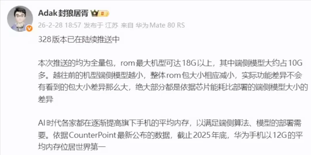 超14GB更新包弹出来那一刻,我就知道这不是一次普通系统升级。Huawei Mate 80 Pro升级HarmonyOS 6 6.0.0.328 Beta,并不是打补丁,而是一次架构级重写。小艺不再只是语音助手,而是调度入口。方言识别进化明显,四川话、粤语可以自然切换回应,识别准确率和反馈速度都有提升。但真正改变使用逻辑的是自动化能力——一句“每天早上推送昨天的科技新闻”,系统自动生成任务并在桌面生成卡片,无需手动设置流程。这代表着,未来使用频率最高的可能不再是某个App,而是系统级AI入口。应用分发权被弱化,系统调度权被强化。这是鸿蒙6真正的野心。通知摘要同样值得关注。多条推送会被本地算力压缩成几句话置顶展示,核心信息被优先呈现。这种能力完全依赖端侧模型,不依赖云端。这背后反映的是算力下沉趋势——手机正在承担更多本地计算任务。亲情防诈功能绑定家人账号后,一旦对方接到风险电话,主设备实时预警,甚至可以远程干预。鸿蒙不再只做单设备体验,而是在构建家庭协同网络。交互层面变化相对克制。控制中心支持竖版亮度条,减少误触;状态栏支持保留常用图标;存储界面加入数据可视化;动态光效逻辑更贴合操作路径。这些不是革命性改变,但属于细节优化。文件删除后列表不刷新,需要手动下拉;游戏切到语音通话后麦克风权限冲突;穿戴设备小组件位置异常;横屏语音输入出现界面重叠;后台切回应用商店顶部状态栏错位;部分场景存在掉帧和音频异常。原因也并不复杂——底层架构大规模重构后,权限管理、资源调度、界面渲染都需要重新适配。端侧模型体积增加,对芯片能耗与调度能力提出更高要求,不同机型之间体验差异会被放大。技术层面可以理解,但用户体验不会为技术买单。系统好不好,首先看稳不稳。从趋势看,鸿蒙6的方向非常清晰:AI入口系统化、本地算力增强、家庭协同扩展。这条路线没有问题,甚至具备前瞻性。真正的挑战在于稳定性打磨周期。端侧模型规模只会越来越大,系统复杂度持续提升,Beta阶段的问题不会一夜消失。如果你是极客型用户,愿意参与测试、接受偶发问题,那么328版本可以体验,它能让你提前感受到鸿蒙6的核心变化。如果你是主力机日常使用者,建议等待正式版。当前版本更像是“抓虫阶段”的技术验证,而非成熟交付。这次升级让我看到鸿蒙6的潜力,也看清了它仍在进化中。AI架构已经搭好,真正决定口碑的,是接下来几次版本迭代能否把稳定性补齐。系统升级不是比谁功能多,而是比谁更可靠。当AI真正成为底层能力时,稳定性才是最大的技术含量。