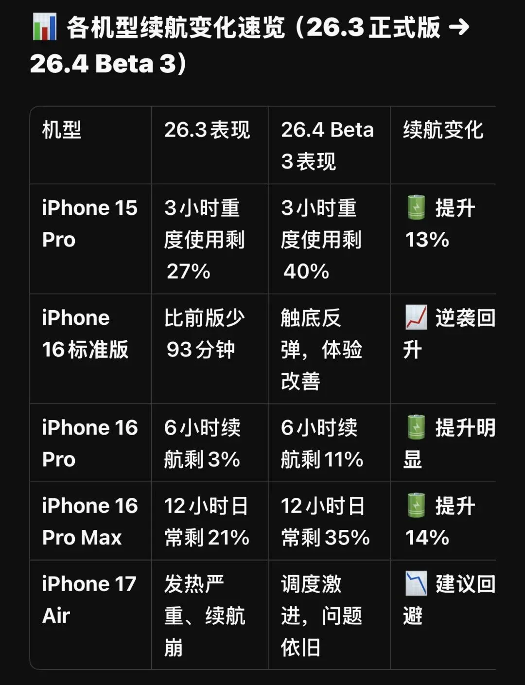 · 16标准版:26.3续航暴跌93分钟,Beta 3终于修复,体验回升。