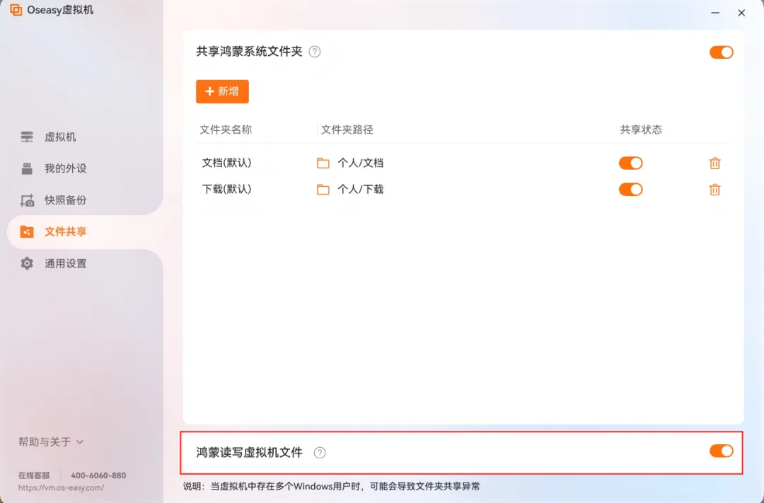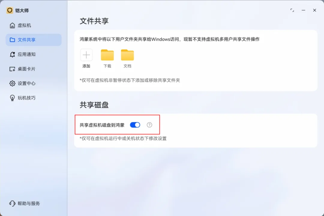 1、在铠大师开启“共享虚拟机磁盘到鸿蒙”,若使用的是Oseasy虚拟机,则开启“鸿蒙读写虚拟机文件”;同时确保铠大师和Oseasy虚拟机均为开机状态。