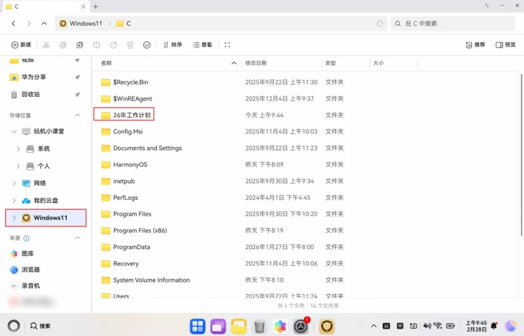 从鸿蒙电脑进入文件管理>Windows 11,即可查看并访问Windows磁盘中的文件了,操作简洁流畅。