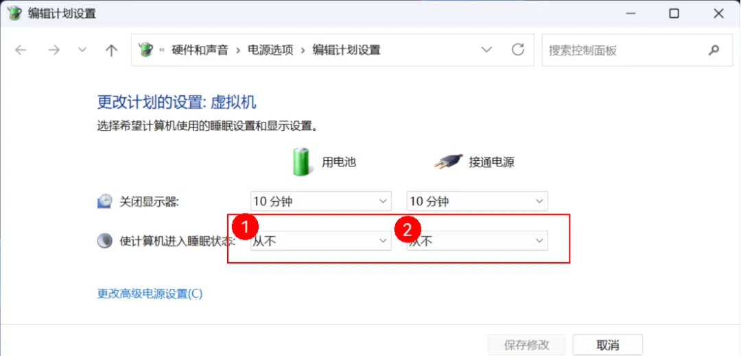(2)若高频使用此功能,建议关闭虚拟机的自动暂停功能,并在Windows电源计划中将睡眠状态设置为“从不”,以避免因休眠或暂停导致共享中断,确保使用更稳定顺畅。
