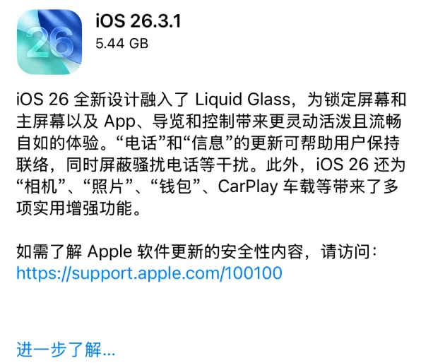 同步更新的还包括:iPadOS 26.3.1 正式版(23D8133)、macOS 26.3.1 正式版(25D2128)、iOS 18.7.6 正式版(22H320)