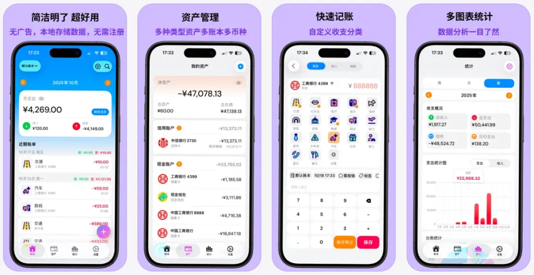 支持极速记账,一键录入、语音输入、自定义分类,智能生成收支图表与预算管理,可自定义标签、备注、搜索查询;支持 iCloud 云同步、FaceID/TouchID 加密保护,多币种多账户管理,并有定期账单提醒,安全高效、随时随地轻松理财。
