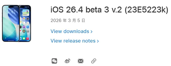 最后总结📝:iOS 26.4 beta 3 v.2(23E5223k)就是一款“新设备专属适配版”,核心是给春季新硬件补兼容性漏洞,普通机型几乎零体验提升,新设备用户可以冲(记得备份),普通用户、二次元党建议直接跳过,别瞎折腾!