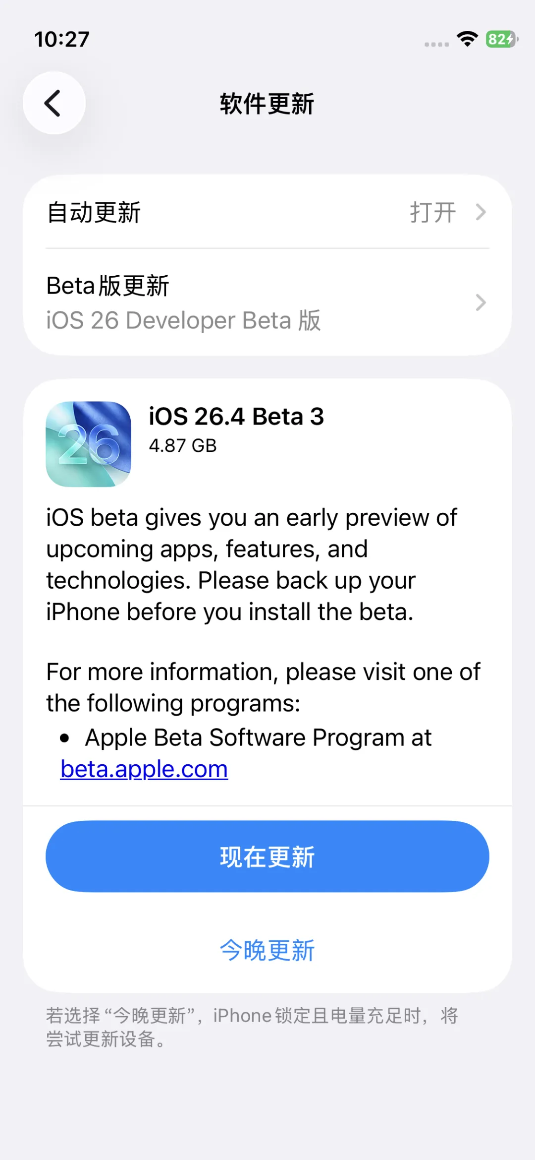 重点划重点⚠️:界面上完全看不到“v.2”的标识,刷更新的时候只会显示“iOS 26.4 beta 3”,只有进设置-通用-关于本机,才能看到版本号变成23E5223k,普通用户更了纯属浪费流量和电量,妥妥的“无效更新”啊喂🤯