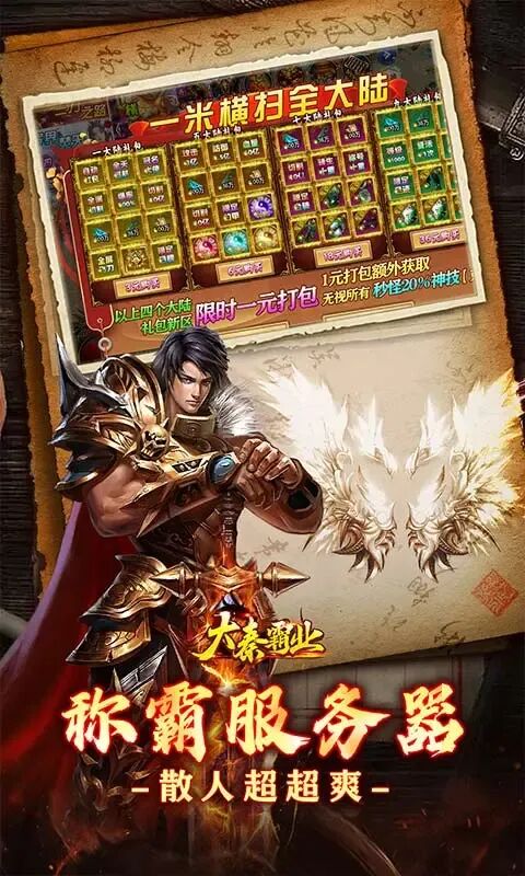 《大秦霸业(玩界三刀超爽福利)》打怪就给礼包币!礼包币=所有大陆礼包!三把大刀环绕自身,四倍打怪速度爽到爆!上线就送免费狂龙,免费仙尊,免费神霄,免费魔渊,免费礼包;本服特色:不卡大陆-毫无套路-时间=称霸服务器!千种装备万种地图,超变玩的就是爽爽爽爽爽!!!千种隐藏BUFF+武学+幻化+英魂+超多好玩玩法等你探索!上线直接爽!礼包直接拿!装备咔咔爆!玩服宗旨爽!!