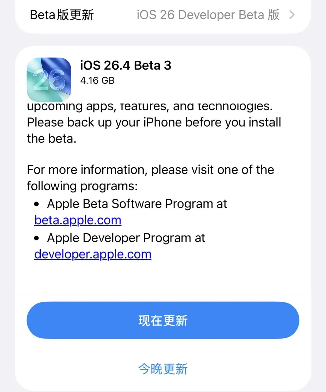 iOS 26.4 Beta 3 v.2(23E5223k)是 Beta 3(23E5223f)的小版本修正推送,无新增功能,仅做适配与修复,核心变化如下: