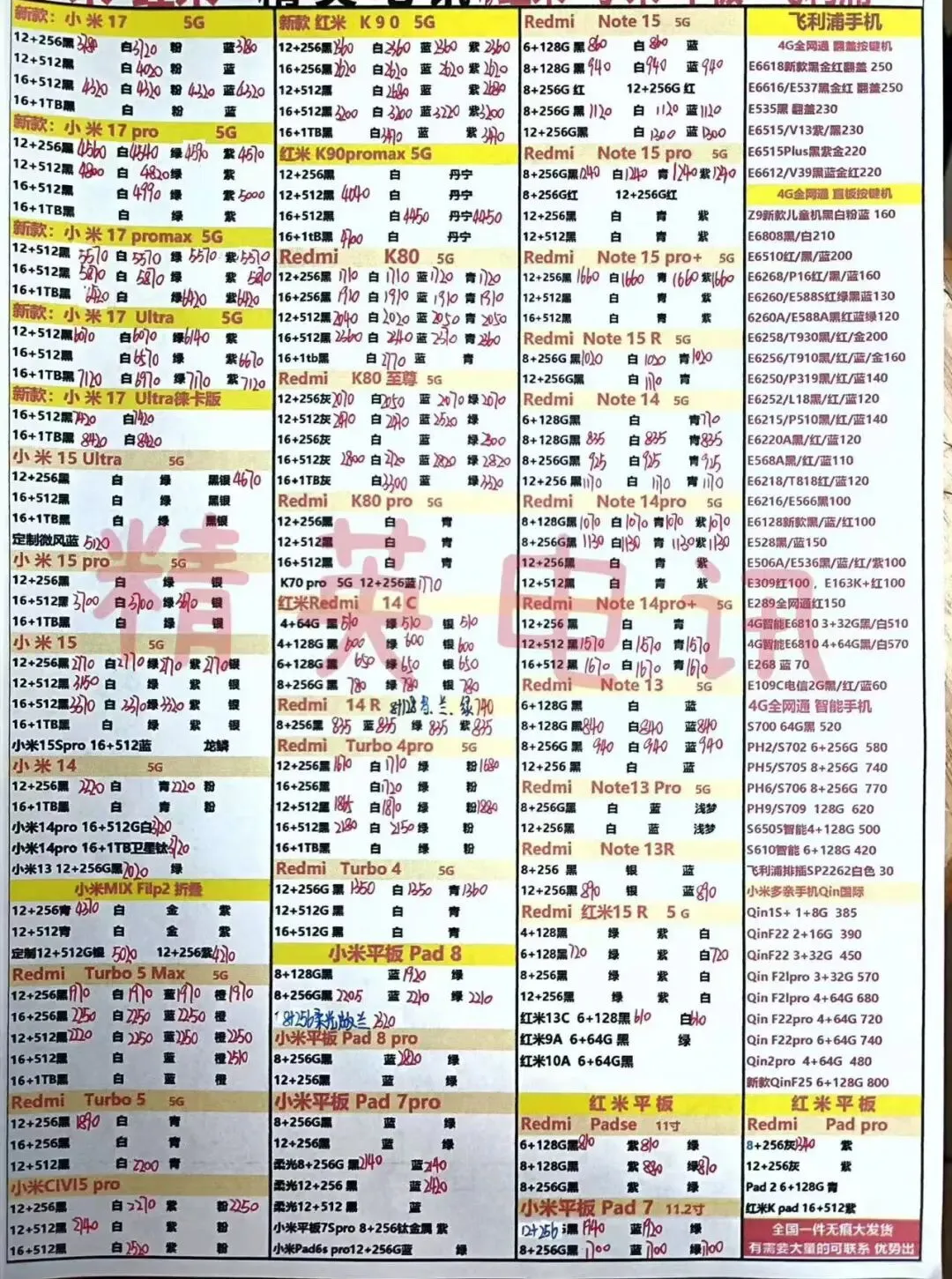 以下报价都是深圳华强北手机批发市场当天的最新批发价格(不含税),报价是我们的批发底价,零售拿货价格需加20~100元不等,京东包邮(量大价格可谈)