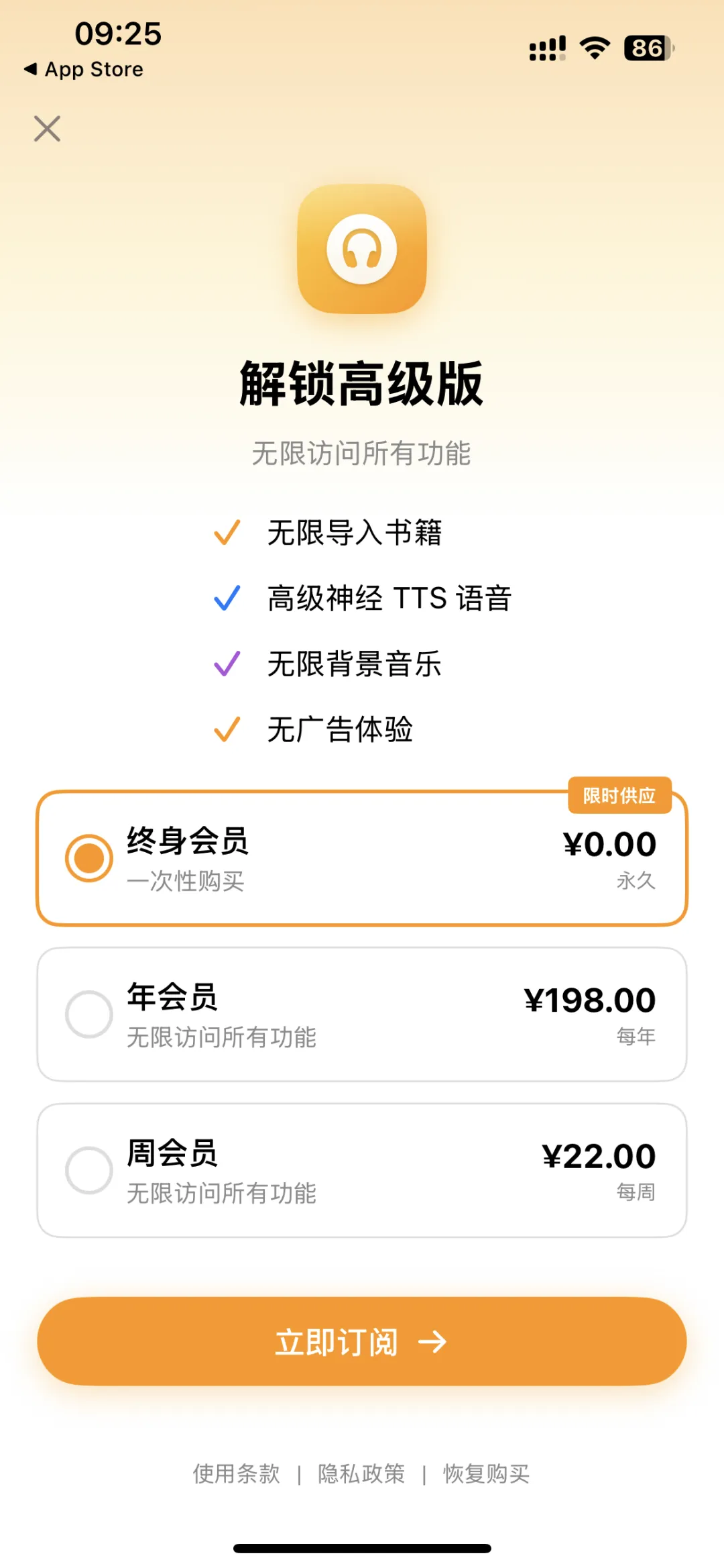 解锁终身会员后,全程无开屏广告、无弹窗打扰,还能调语速、设睡眠定时,睡前用都合适。