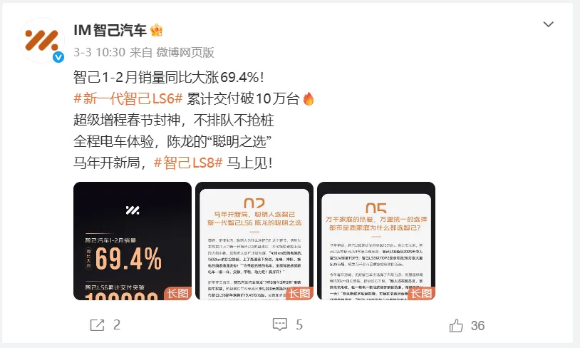 当然,无论是公布1-2月交付量,还是只公布销量,都不如智己机灵,人家就只说“1-2月销量同比大涨69.4%!”。