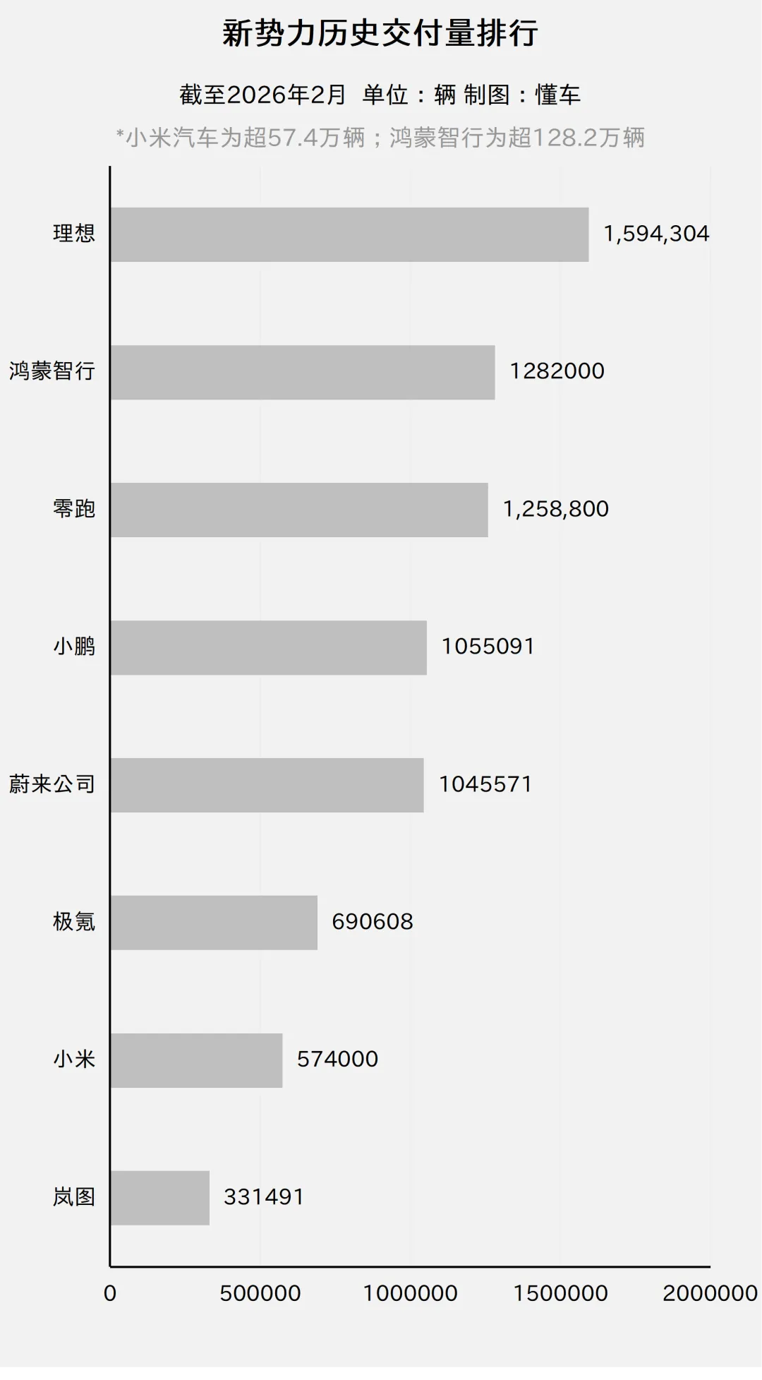 以下是完整“2月新势力交付排行榜”、“1-2月新势力交付排行榜”、“历史累计交付量排行榜”: