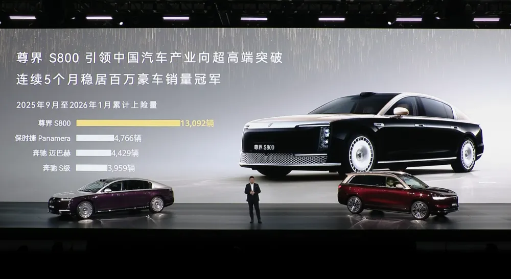 如果说问界M9是中坚力量的代表,那么尊界S800则是华为助力中国汽车工业向上突破的旗舰符号。上市9个月,尊界S800累计交付量已超15000辆,连续5个月稳居百万级豪车销量冠军。更关键的是,其2025年9月至2026年1月的上险量达13092辆,相当于保时捷Panamera、奔驰迈巴赫、奔驰S级三款竞品销量之和。作为首款搭载896线激光雷达的超豪华车型,尊界S800不仅将华为全栈技术(途灵智能底盘、鸿蒙座舱、800V高压平台)集于一身,更以"科技豪华"重新定义了百万级豪车的价值标准。搭载896线激光雷达的尊界S800,建议零售价72.8万元起。余承东强调:"尊界S800的突破,证明了中国品牌有能力在超高端市场与国际巨头正面竞争,这是中国汽车工业向上突破的里程碑。"七、鸿蒙智行:128万辆交付,连续14个月成交均价第一