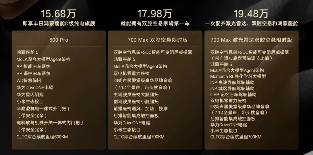 在以往我们的认知当中,传统合资车企,尤其是日系合资品牌的电动化转型并不算快的那一个。一方面,这和日系品牌对电动化的认知滞后有关,也与其全球市场表现有关,毕竟即使电动化已经成为了趋势,丰田也还是那个销量全球第一的车企。当然,电动化势不可挡,尤其是在国内市场,传统日系燃油车的市场份额被国产新能源品牌快速抢占,日系合资销量下滑明显,即使丰田坐得住,广汽和一汽也未必能坐得住。于是,一些更符合中国市场的“特供车型”就这样出现了。而在近日,广汽丰田正式发布铂智7,从配置上来看,可以说是相当拼的一台车。3月5日,广汽丰田旗下全新纯电车型——铂智7正式预售,新车共推出7款车型,续航有600km、700km、710km三个版本,预售价格区间为15.68-20.98万元。除了诸如双腔空悬、激光雷达等配置外,还集齐了华为和小米的技术加持,用上了鸿蒙座舱并接入了小米生态。众所周知,小米汽车和华为鸿蒙智行的部分粉丝们在网上基本是水火不容的级别,能够一次集齐这两家企业技术的,从某种意义上来说也是相当有趣。从外观来看,广汽丰田铂智7依然采用的是铂智系列的家族式设计语言,前脸采用封闭式格栅,车顶搭载有激光雷达。大灯采用分组设计,上方为C字贯穿式行车灯,下方为远近光一体大灯,车灯左右还设计了风道。整车用了许多平直线条强化车身运动感,机盖上拥有两条凸起的筋线,前包围设计夸张,底部还带有散热格栅。铂智7长宽高分别为5130/1965/1506mm,轴距为3020mm,定位中大型纯电轿车。车身型面复杂,后半段采用溜背设计,全景天幕与后挡风玻璃相连,结合C柱大面积侧窗的设计,十分动感。新车取消了电子后视镜,改用传统后视镜方案,使用无边框车门,同时将隐藏式把手改为了半隐藏式。尾部依然是贯穿式尾灯设计,在左右两侧也有风道。尾部上方还有小鸭尾,搭配底部熏黑的后包围,与整车运动化的风格相符。至于内饰部分,铂智7还是走了简约科技风的路线。三辐圆形多功能方向盘,前方为一块8.8英寸液晶仪表,上方还带有HUD。考虑到国内市场对于内饰的高要求,铂智7内饰也大量采用了软质包覆提升内饰质感,并辅以木质饰板、金属哑光饰条来作为点缀。中控台搭载了一块了15.6英寸的2K中控屏,车机采用的是鸿蒙座舱5.0系统,能与华为系手机进行车手互联等操作,也支持华为星闪钥匙。同时,作为一台接入了小米车载生态系统的车型,它还能够在车机上远程控制小米的智能家居,并能够连接小米平板、音响、手机等等设备。也就是说无论是手持小米手机还是华为手机,都能够与这台车的车机系统进行互联,因此它也成为了华为+小米双生态第一车。铂智7采用怀挡的换挡机构,中央扶手区域前端保留了空调调节的实体按钮,后方为50W手机无线充电面板,以及两个杯架和中央扶手箱。座椅方面,前排主副驾带有座椅加热、通风和按摩功能,并支持零重力座椅。二排座椅也支持加热和通风功能。动力续航部分,新车搭载华为Drive One电驱,使用后置单电机,最大功率207kW,最高车速180km/h。采用中创新航磷酸铁锂电池,提供88.13kWh、71.35kWh两种电池组,其中88.13kWh电池组对应的CLTC续航里程为700km/710km,71.35kWh电池组对应的纯电续航为600km。铂智7使用前双叉臂后多连杆悬架,配双腔空气悬架+SDC智能可变阻尼减振器,并配备舒适制动功能。辅助驾驶方面,铂智7搭载了激光雷达+27个传感器,使用Momenta R6飞轮大模型辅助驾驶,能够实现城区和高速的高阶智能辅助驾驶,且支持智能泊车。总得来看,广汽丰田对这台铂智7的堆料还是比较狠的,不同于以往一些丰田车型,它在包括硬件配置、内饰软装、智能化功能等都有大幅改进。华为鸿蒙座舱的加入以及小米生态的接入,更是为它带来了更便利实用的功能和科扩展性,也算是打破了丰田车型智能化老旧不好用的刻板印象,当然,仅限铂智系列。目前丰田在国内仅bZ系列以及铂智系列为纯电车型,但整体销量都不高。其中广汽丰田铂智3X是销量最高的纯电车,1月份其销量为5228辆。从单一的丰田品牌来看,铂智3X还是比较成功的,而它靠的也是精准把握国内市场消费者的需求,在配置以及价格上有所突破。铂智7毫无疑问,也是同样的路线,且更加激进,目前铂智7已开启预售,预售价为17.98-23.48万,补贴后的价格为15.68-20.98万。今年汽车市场竞争依然激烈,市场格局也仍然在剧烈变化当中,对于广汽丰田来说,铂智7能否成功将是重要一战。那么,你们认为铂智7能否有好的销量呢?欢迎留言讨论。
