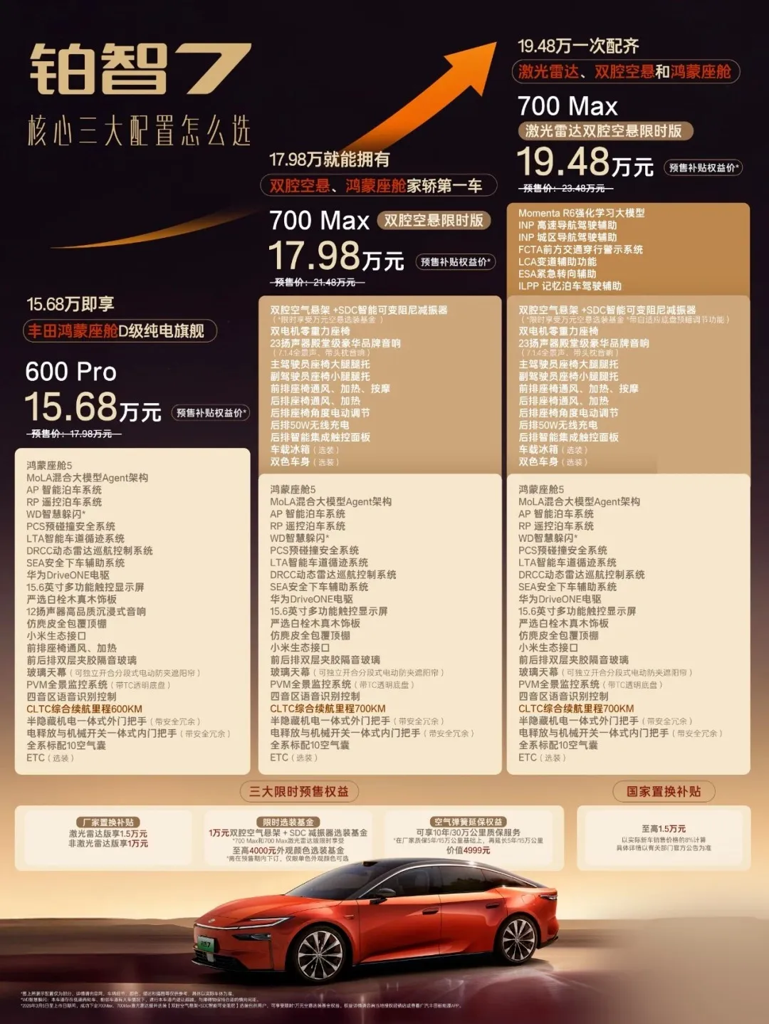 卷疯,19.48万就把鸿蒙+激光雷达+双腔空悬都弄全, 丰田这台新车可太懂上班的人,朋友们,有谁能懂😭想要在20万左右买台纯电轿车,简直就好像在闯关一样作为月薪几千的普通上班的人,选车就一个要求,不凑合,智能得顺滑,驾乘得舒服,配置不能少,最好还有可靠品牌做依靠,不用后面操心修修补补,可左比右比,要么就是配置分开卖,鸿蒙座舱和激光雷达只能选一个,要么就是勉强凑齐两个,价格直接就超过25万,超预算很多, 而双腔空悬,以前就只在几十万的豪华车上能见到,普通人想都不敢想。就在我快要准备妥协的时候,广汽丰田铂智7忽然出现,直接打破了20万级纯电的内卷天花板19.48万, 鸿蒙座舱、激光雷达、双腔空悬这三个核心配置一下子就全都有了,而且还是丰田生产的,这份诚意,直接就把同级别车型比下去了,也完全改变了我对丰田老派、守旧的固有印象。说起丰田, 大伙脑海里的关键词一直都是皮实耐用、省油省心,可它的短处也很明显,智能配置跟不上时代,内饰又老旧又沉闷,开出去老是被人笑话是父辈座驾,很难符合年轻人的审美和需求。铂智7,更像是丰田的年轻化转型佳作, 既守住了品牌印在骨子里的可靠基因,还精准切中了年轻人的喜好,把智能和豪华做到了同级别顶尖,就像稳重可靠的老大哥,忽然跟上了潮流步伐,既有安全感,又有新鲜感,越看越觉得满意。作为华为手机用户,铂智7的鸿蒙座舱5.0,直接就击中了我的心,不像市面上大多数合资车机那样卡顿迟缓,它的鲁大师跑分在鸿蒙车型里排在首位,还是前十里唯一的合资车,点开应用、切换界面特别顺滑没有延迟,就像手机操作一样, 完全摆脱了车机卡顿的苦恼。更有用的是,有150多项语音控制,模糊的指令也能精确识别,开车的时候,不用低头动手,随便说一句小丰田,调24度空调导航去公司,全程用语音就能够解决,老人小孩也能轻松学会,而且,还和华为手机深度连接, 导航、歌单一上车就自动同步,再也不用麻烦地去连蓝牙、传文件,实用性非常高。对于常常通勤、偶尔跑高速的人来讲,激光雷达的添加,就是移动的安全屏障,铂智7搭载的激光雷达,配上MomentaR6大模型智驾系统,再加上27个传感器,构成360度无死角的感知网,300米的探测距离远远超过人类的视野, 可以提前预判高速急刹、市区鬼探头等风险,反应比人类驾驶员快0.3秒,能及时预警甚至自动制动。高速开启领航辅助,自动跟着车走、平稳变道、保持安全距离,完全解放双手双脚,长途开车再也不会腰酸背痛,在市区堵车的时候,跟车功能也特别省事,不用频繁踩刹车油门,堵车也能变得很淡定, 更让人放心的是,这套系统严格按照丰田14项安全要件来,新手也能放心开。最让人没想到的是,19.48万就能有双腔空悬这个以前专门给豪华车用的配置,现在被铂智7下放到20万级,满满的全是诚意, 这套由雷克萨斯和GR运动部门一起调校的悬架,有两个独立气室,可以智能调整软硬和车身高度,在市区通勤时过滤颠簸,高速过弯平稳不发飘,智能预瞄功能还能提前应对减速带和坑洼地方,老人小孩坐后排再也不晕车,904万次耐久测试,比行业标准还多一倍,耐用性不用发愁。除了三大核心配置,铂智7的细节同样到处展现出越级的质感,入门款就有白栓木真木饰板、座椅通风加热,还有20英寸的轮毂,高配的零重力按摩座椅,坐很久也不会疲倦, 依靠华为DriveONE电驱平台的帮助,5.1秒就能实现破百,既平稳又迅猛,而且还有700km的超长续航,再也不用为续航问题犯愁。以前总觉得,20万左右的车只能做选择,可是铂智7用实力向我们证实,鱼和熊掌是可以同时得到的,花19.48万就能拥有豪华配置以及丰田品质,妥妥就是打工人理想的车子,目前铂智7已经开始预售,15.68万起, 19.48万就能配备全三大核心配置,限时的优惠并不能错过。这一回, 丰田完全摆脱了老式的标签,铂智7带来的新感觉,既有可靠的基础,又有年轻的活力,互动话题,预算大概20万上下, 你会挑选铂智7这台全能卷王吗,它的哪一个配备最能让你心动