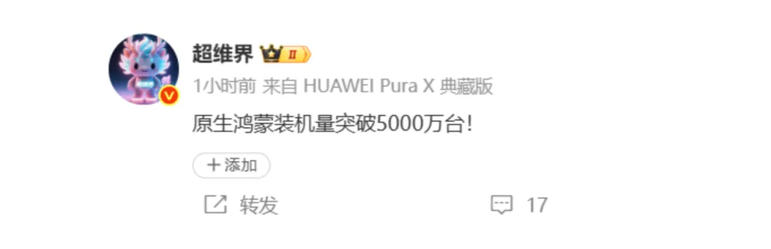 一个关键数据直接把市场情绪拉满——装机量从4000万台冲到5000万台,仅用了9天时间,单周期新增1000万台设备。更重要的是,这不是靠概念炒作堆出来的数字,而是实打实的设备激活量。华为这一步真正的意义,在于把“纯原生鸿蒙”推到了规模化阶段。所谓纯原生,并不是简单套壳安卓,而是基于鸿蒙底座从应用框架到系统能力全面重构。包括银行类APP、电力调度系统、政企应用等高优先级场景陆续上线,这意味着鸿蒙正在从消费市场渗透到产业应用层。硬件端,Mate 80系列持续热销,成为纯原生鸿蒙的重要载体。同时nova 15系列赶上国补政策,换机门槛降低,不少用户升级设备的同时直接升级系统版本。这种“新机+系统”同步推进的方式,加速了装机规模扩张。从用户体验角度看,很多升级用户反馈最明显的变化是跨设备协同能力。手机和手表之间的文件传输更流畅,车机联动操作更顺滑,应用切换延迟明显降低。配合AI能力增强,拍照优化和语音响应速度都比老系统更快。微信、支付宝尚未推出完整的原生版本,依然是用户关注的核心问题。目前5000万装机量主要集中在国内市场,海外设备渗透率几乎为零。第四,虽然OpenHarmony已经开源,但其他厂商参与度有限,生态扩展速度依然主要依赖华为自身硬件。但当前芯片产能仍处于紧张状态,规模扩张还需要供应链进一步稳定。整体来看,5000万装机量意味着鸿蒙正式进入规模化阶段。但真正决定它未来高度的,不是数字增长速度,而是生态补齐和跨品牌扩展能力。