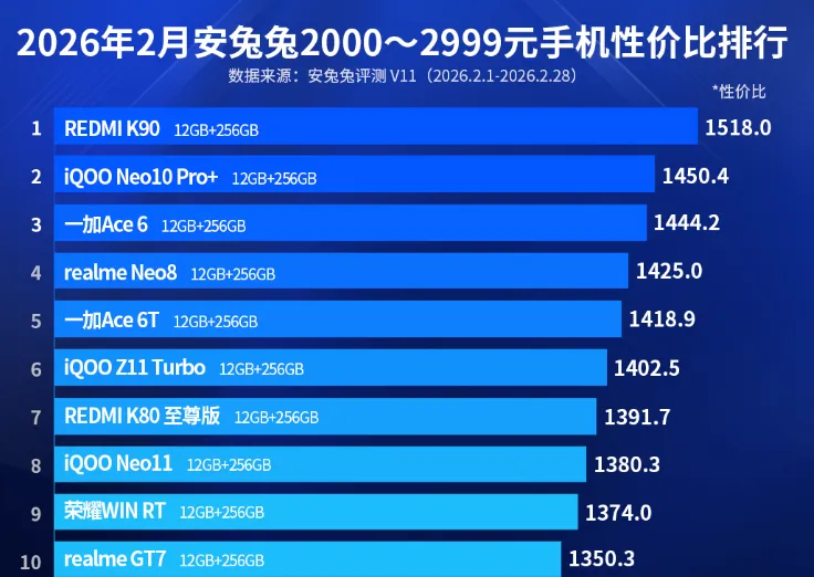 前三名依次是REDMI K90、iQOO Neo10 Pro+、一加Ace 6。