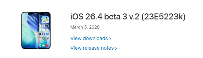在3月6日凌晨时段,苹果发布 iOS 26.4 beta 3 内测系统,该系统与上一个beta3版本不同,这是修订版,疑似添加新设备测试,但这次官方命名为 iOS 26.4 beta 3 v.2 (23E5223k) 系统,特别有趣。