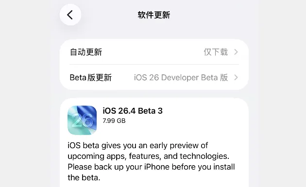 iOS 26.4 beta 3 修订版更新内容: