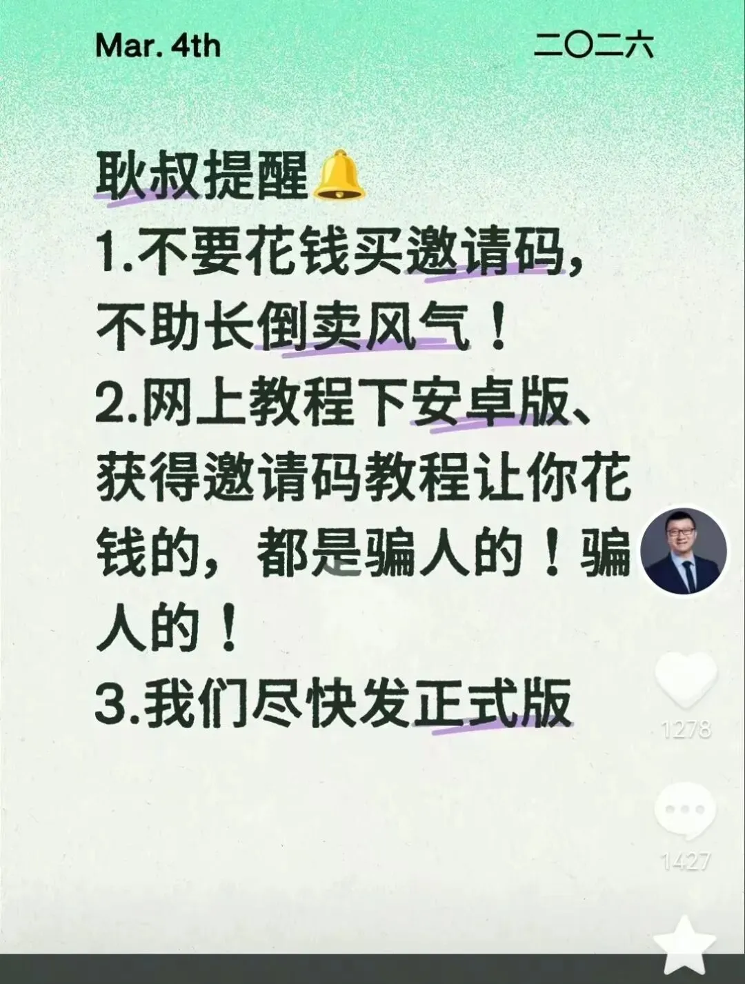 新年过后,圈内最大的一件事便是耿乐的新软件在苹果端对内测试的新闻,而且苹果端的邀请码也是遭到大家哄抢,甚至有人开始倒卖!对此,耿乐也是出面提醒,不要花钱买邀请码不助长倒卖风气;网上教程下安卓版获得邀请码教程让你花钱的,都是骗人的!骗人的!我们尽快发正式版!