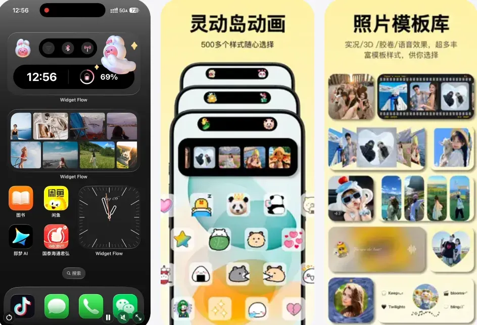 除了桌面组件,App还提供了多款锁屏灵动岛样式供你选择。你可以把照片、天气、快捷方式、动画、日历、时间进度等放上岛,搭配超过100种动画和几百个自定义表情,个性化程度超高。