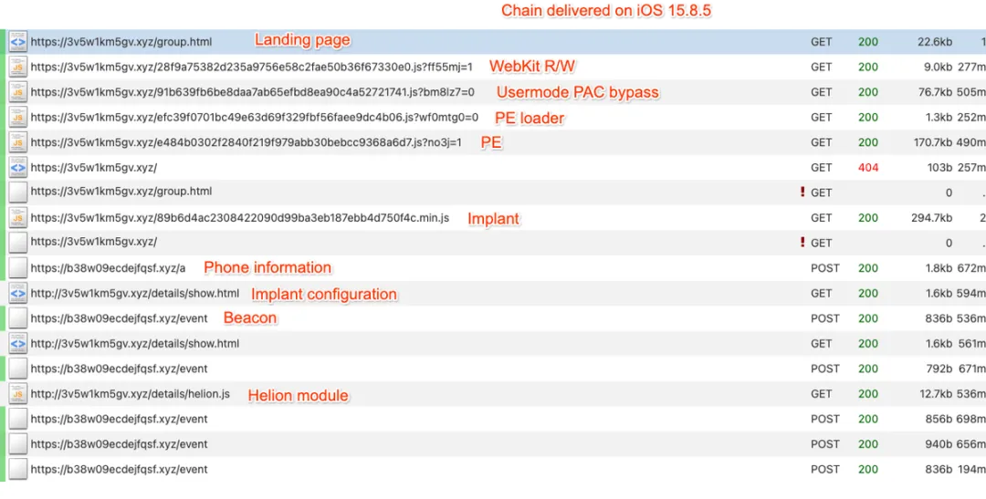 图6展示了从网络角度看,一台运行iOS 15.8.5的iPhone XR被感染的完整过程: