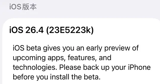 同步地进行推送了iOS 26.4 Beta 2公测版、iPadOS 26.4 Beta 2公测版、macOS 26.4 Beta 2公测版以及watchOS 26.4 Beta 2公测版。