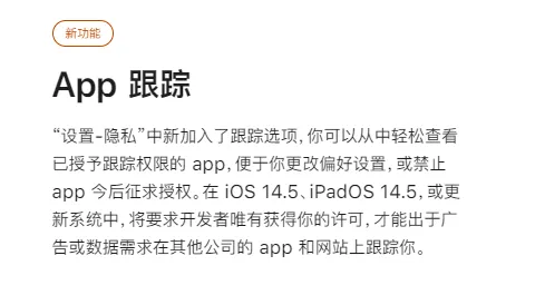 其实苹果在去年 6 月份的 WWDC 上,就修改了 iOS14 上跟踪 IDFA 的权限,把这个权限交由了用户决定。