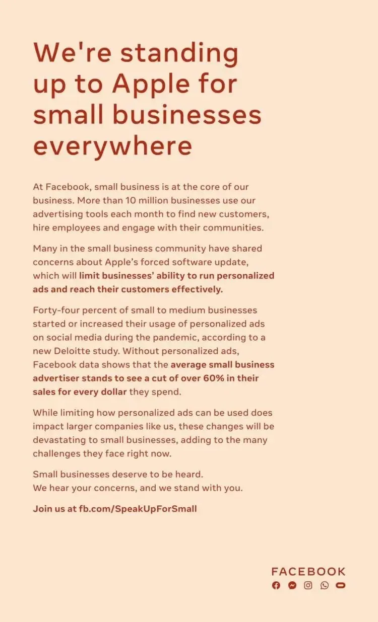 这就直接导致了 Facebook 率先在《纽约时报》等媒体上刊登了 diss 苹果的公告,标题写着:“为了各地的小公司,我们决定站到苹果的对立面”