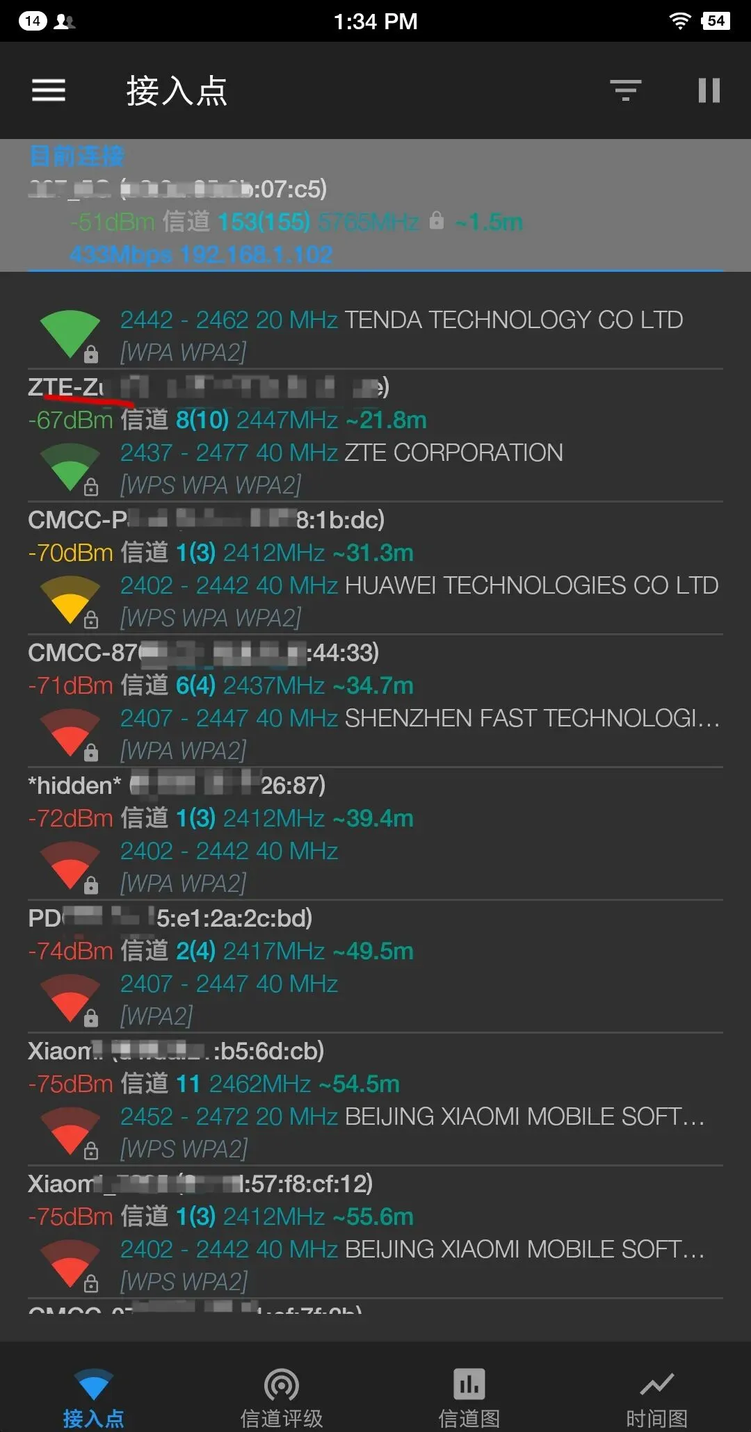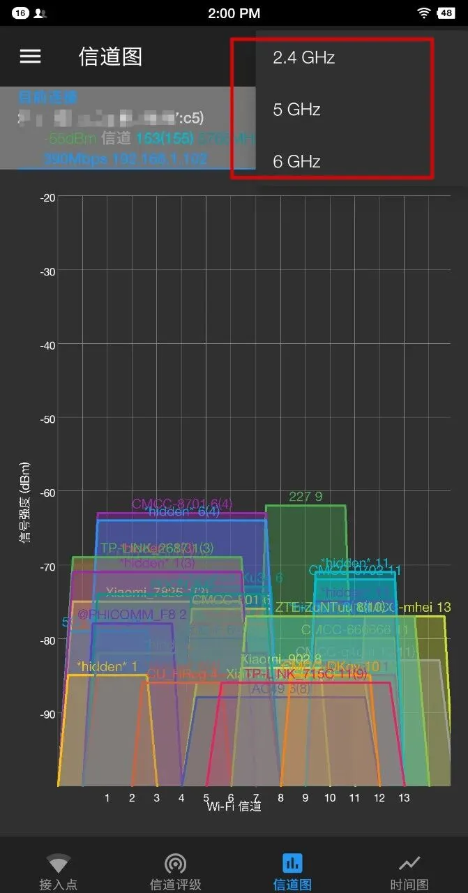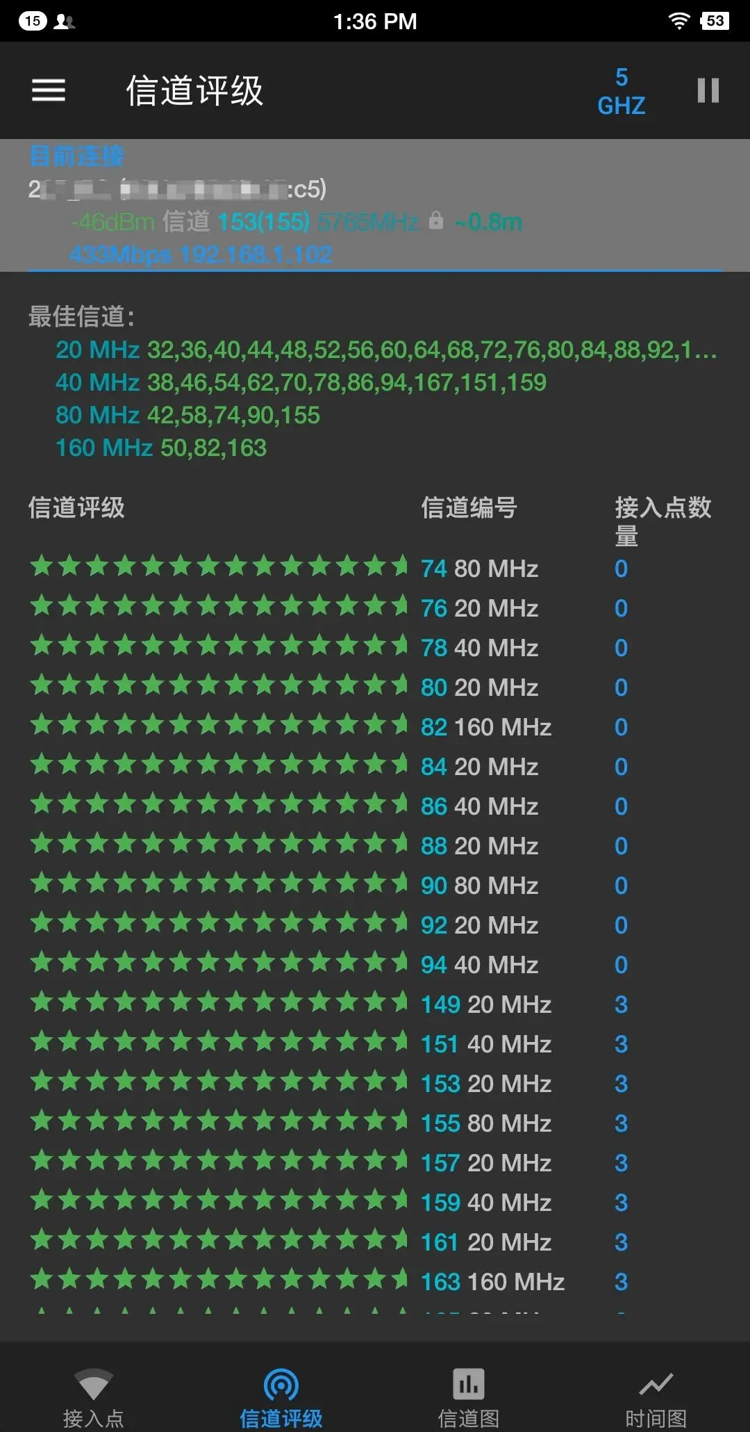 下方底部导航栏分为:接入点,信道评级,信道图,时间图,大家可以直接查看信道评级,这里直接告诉用户哪个信道最通畅。