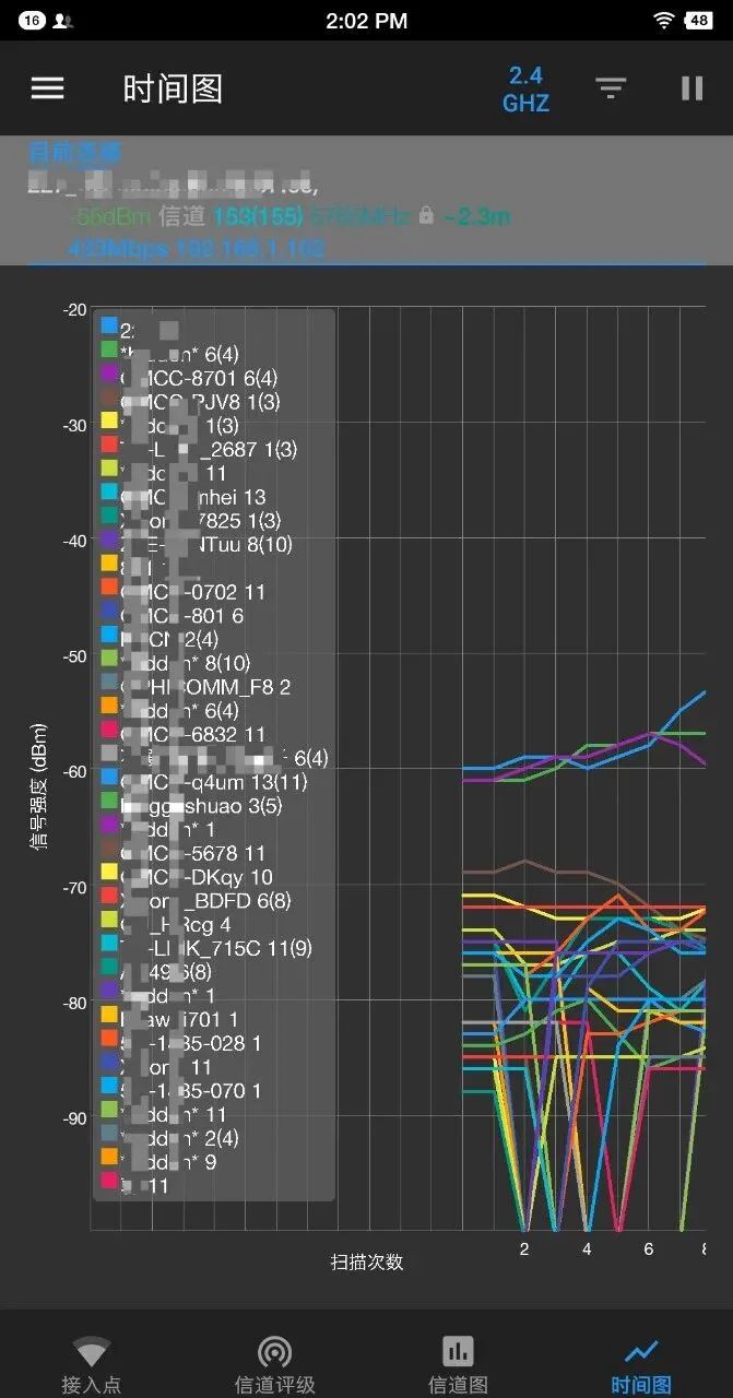通过该软件知道最通畅的信道后,用户可以直接登陆路由器后台改成这个最通畅的信道,相信网速必会有所改善。下图是腾达路由器设置的截图,路由器不同具体设置的位置也不一样,通常情况下是在无线设置中可以修改。下面是信道图和时间图功能,也就是将软件扫描到的wifi信息以图表的形式展现给用户,方便用户进行分析和查看。软件支持2.4Ghz,5Ghz,6Ghz的信号,但是目前支持6Ghz的手机应该还不是多,所以大部分手机应该是扫描不到6GHz的信号的,毕竟硬件不支持。安卓6以上的用户在使用的时候需要打开GPS并且授权给软件,否则软件无法扫描到信号,这貌似是安卓系统的某些限制的的原因才需要打开的。