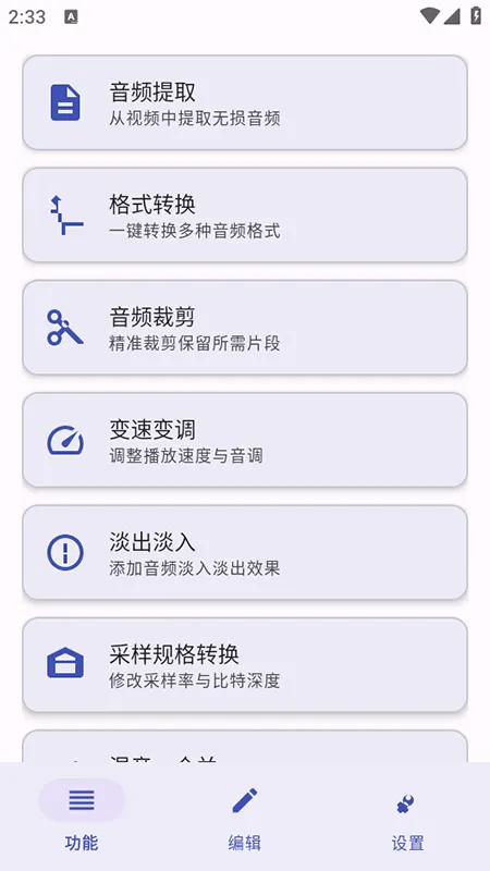 音频倒放、格式转换、裁剪、变速、立体环绕、修改元数据。