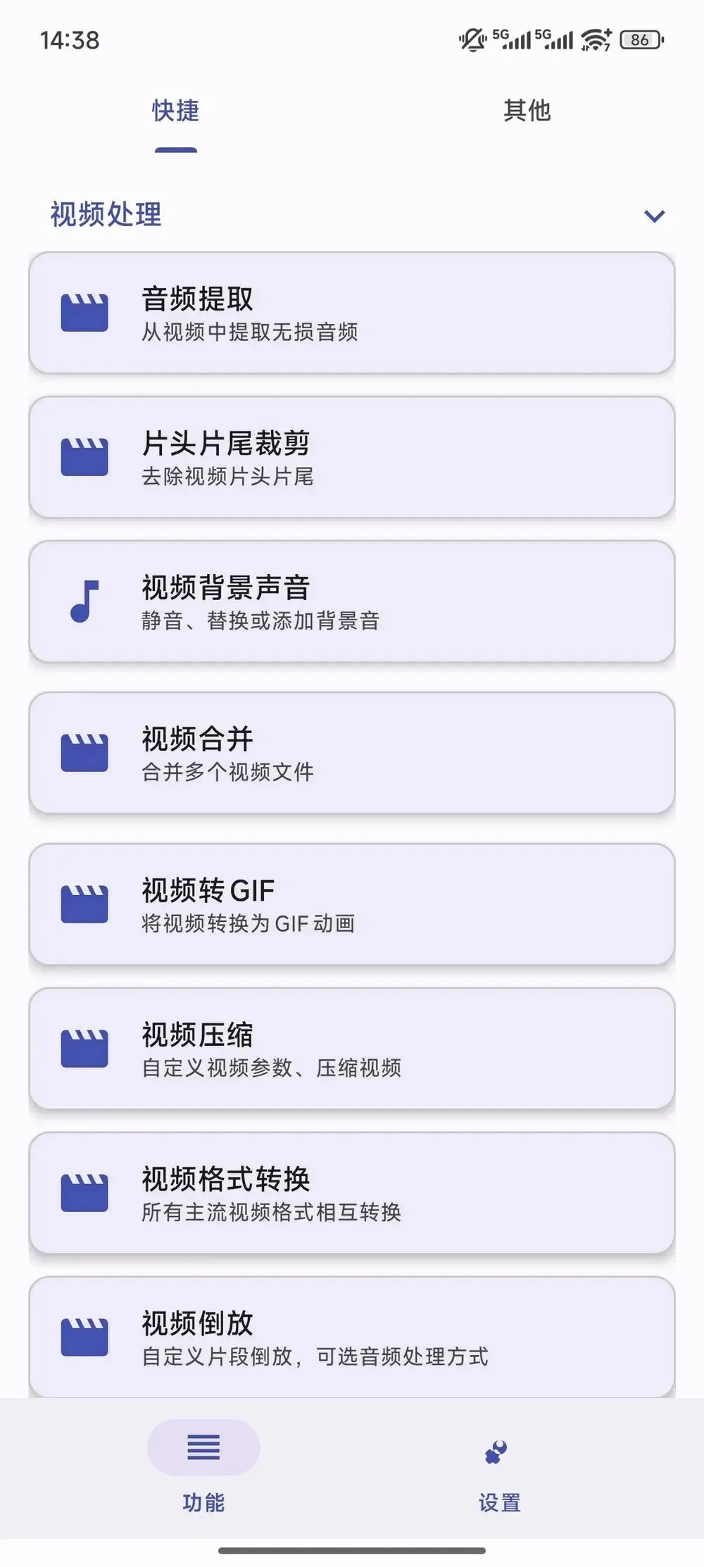 它可以将视频提取为MP3音频格式、裁剪片头片尾、合并视频、转为GIF、压缩视频、格式转换、倒翻视频、AI修复视频。
