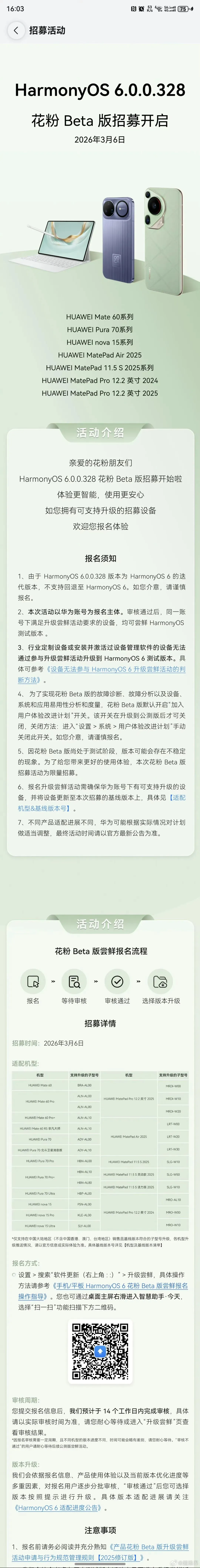 不支持回退:这是最关键的一点!由于HarmonyOS 6.0.0.328是HarmonyOS 6的迭代版本,一旦升级,将无法回退到之前的HarmonyOS 6版本。如果你对系统稳定性要求极高,或者手机是工作主力机,请务必谨慎报名。默认加入用户体验计划:为了帮助华为更好地诊断和分析问题,提升系统易用性,花粉Beta版会默认开启“加入用户体验改进计划”。这个开关在升级到后续的公测版本后才可以手动关闭。如果你比较在意数据收集,这一点需要考虑清楚。可能存在不稳定现象:Beta版毕竟是测试版本,可能会存在一些bug或者不稳定的情况。比如某些应用闪退、耗电异常、功能异常等。追求极致稳定体验的用户,建议还是等待后续的公测或正式版。务必备份数据:虽然官方说明本次升级不会删除用户数据,但强烈建议你在升级前,手动备份好手机里的重要资料,比如微信聊天记录、照片、文件等。以防万一,总是没错的。确保基线版本:报名前,请先确认你的设备系统已经升级到了本次招募所要求的基线版本。如果版本不对,需要先升级到指定版本,才能报名成功。每次鸿蒙系统的大版本更新,都会带来不少新特性和体验优化。这次的6.0.0.328作为迭代版本,相信会在流畅度、稳定性、功能细节上有所提升。对于喜欢折腾、乐于反馈问题的花粉朋友来说,参与Beta版测试不仅能第一时间体验新系统,还能为鸿蒙生态的完善贡献自己的一份力量,还是挺有意义的。不过还是那句话,Beta版有风险,升级需谨慎。如果你决定报名,一定要仔细阅读官方的活动规则和注意事项,并做好数据备份。审核结果和推送时间,请以官方通知为准。声明:以上信息综合自网络爆料,具体参数以官方发布为准。配置信息或存在迭代或误差可能,理性看待爆料内容哦,相关内容与截图源于知名博主或官方信息,引用仅用于数码交流使用,如侵权请及时告知删除,致谢!