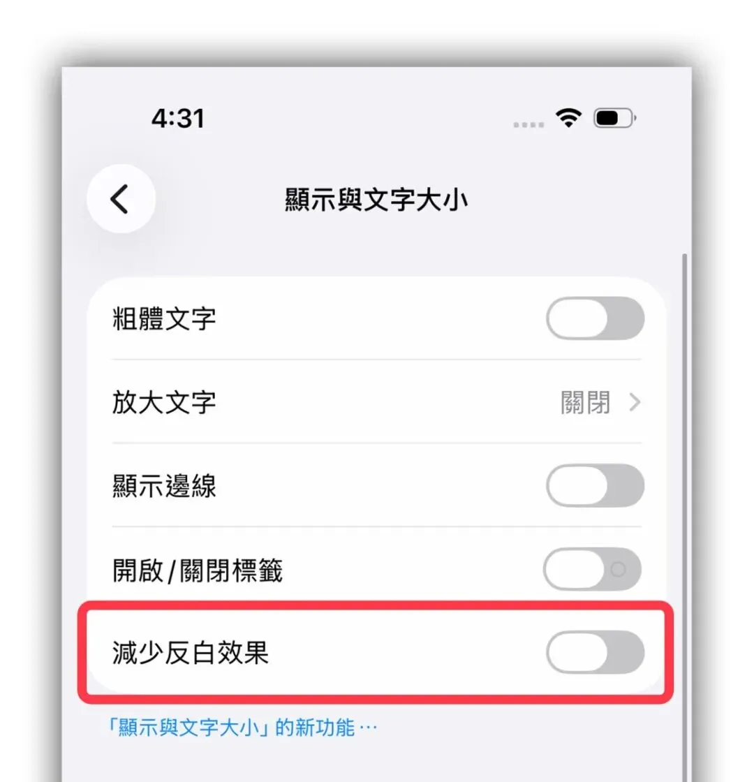 iOS 26.4 Beta 2 曾在「设定」→「辅助使用」→「显示与文字大小」中新增「减少反白效果」选项;不过「减少反白效果」在Beta 2、Beta 3 开启后都没有任何变化,因此还不确定实际作用为何?
